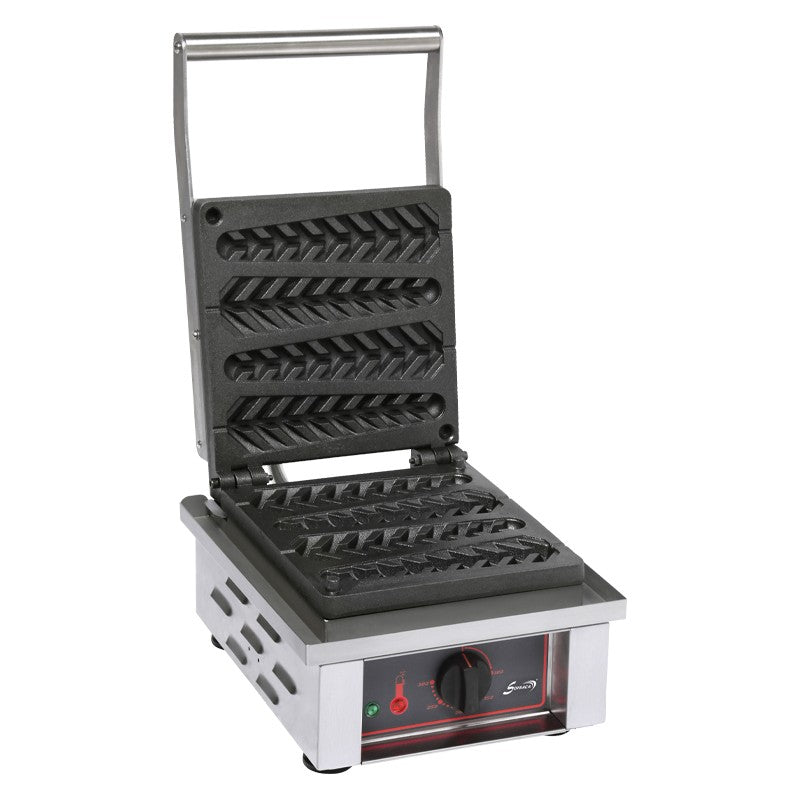 - Ce gaufrier est équipé d'un plaque en fonte à forte valeur de conduction, pour une répartition homogène de la chaleur, et a aussi un bac de récupération de l'excédent de pâte, qui est amovible pour un nettoyage facile, avec un interrupteur marche/arrêt, 1 thermostat de régulation 0-300°C et 1 voyant de contrôle. La plaque en fonte dispose d'un moule à 4 bâtonnets pour la cuisson de gaufres en épis.