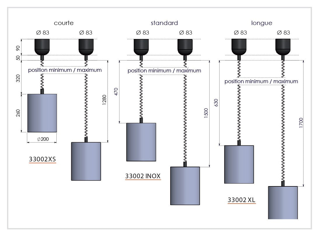 - Cette lampe de maintien en température est équipée d'un câble spirale adapté pour les plafond haut qui permet un réglage facile de la source de chaleur. Longueur de 1200 à 2100 mm.