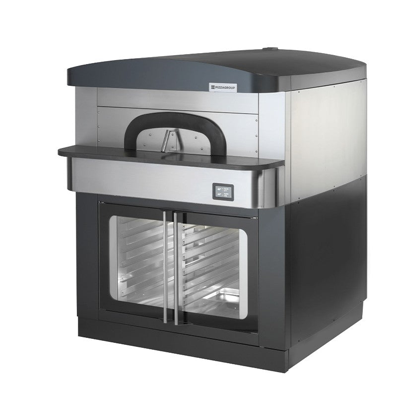 - Le four est livré en une seule pièce. Il se compose d'une étuve, d'un four et d'une hotte d'aspiration. La hotte dispose d'un système innovant avec une activation automatique d'aspiration, éclairée par un LED et directement contrôlable depuis l'écran tactile de 5 pouces. Son système révolutionnaire aspire les fumées tout en maintenant une température stable dans la chambre sans créer de points froids ou chauds. L'étuve de fermentation à température contrôlée atteint 60 °C et contient un maximum de 24 bacs en plastique. Elle est munie d'une lumière LED et de portes en verre pour permettre un contrôle constant.