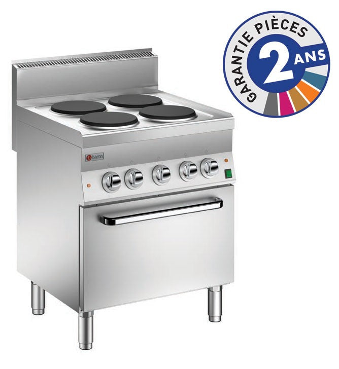 - Ce fourneau à 4 plaques électriques sur four électrique de Baron fait parti de la Gamme 650, qui a été étudiée pour les professionnels de la cuisine ayant un problème de place, mais ne voulant pas renoncer aux hautes prestations des appareils. Facile à nettoyer, simples à intégrer, c'est une concentration de prestations pour les espaces restreints. Un programme aux grandes possibilités et à haut rendement pour sa facile et rapide mise en marche. Une gamme d'appareil de cuisson modulaire entièrement construit en acier inox AISI 304, avec finition externe satinée, profondeur des appareils 650 mm et une construction en conformité avec la norme NF et aux normes européennes.