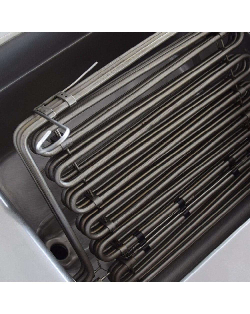 - Cuve en acier inox AISI 304 à zone froide, avec filtre de fond de cuve amovible et couvercle, robinet de vidange à clapet, bac de récupération avec filtre