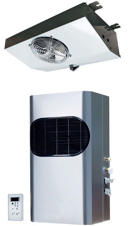 - Groupe frigorifique split à paroi verticale, négatif -15/-25°C pour chambres froides négatives de petits et moyens volumes. Montage sur la paroi avec l'unité de condensation à l'extérieur et l'unité d'évaporation à l'intérieur. Groupe frigorifique prêt à brancher et facile à poser. Utilisation conseillée pour des températures ambiantes supérieures à 0°C (penser à protéger le groupe frigorifique des intempéries en cas d'installation à l'extérieur). Ce groupe frigorifique négatif avec système split à paroi verticale est équipé d'un compresseur hermétique, d'une sonde de sécurité pour la signalisation de l'alarme, d'un panneau de contrôle avec commande, du dégivrage cyclique par gaz chaud, d'un tuyau préchargé (L: 2,5 m) de l'élimination automatique de l'eau de condensation et des batteries d'échange thermique évaporateur et condenseur par tube en cuivre rainuré et ailettes en aluminium. L'expansion du gaz est faite par capillaire. Le gaz utilisé est le R452A. Le hublot d'éclairage est à prévoir.
