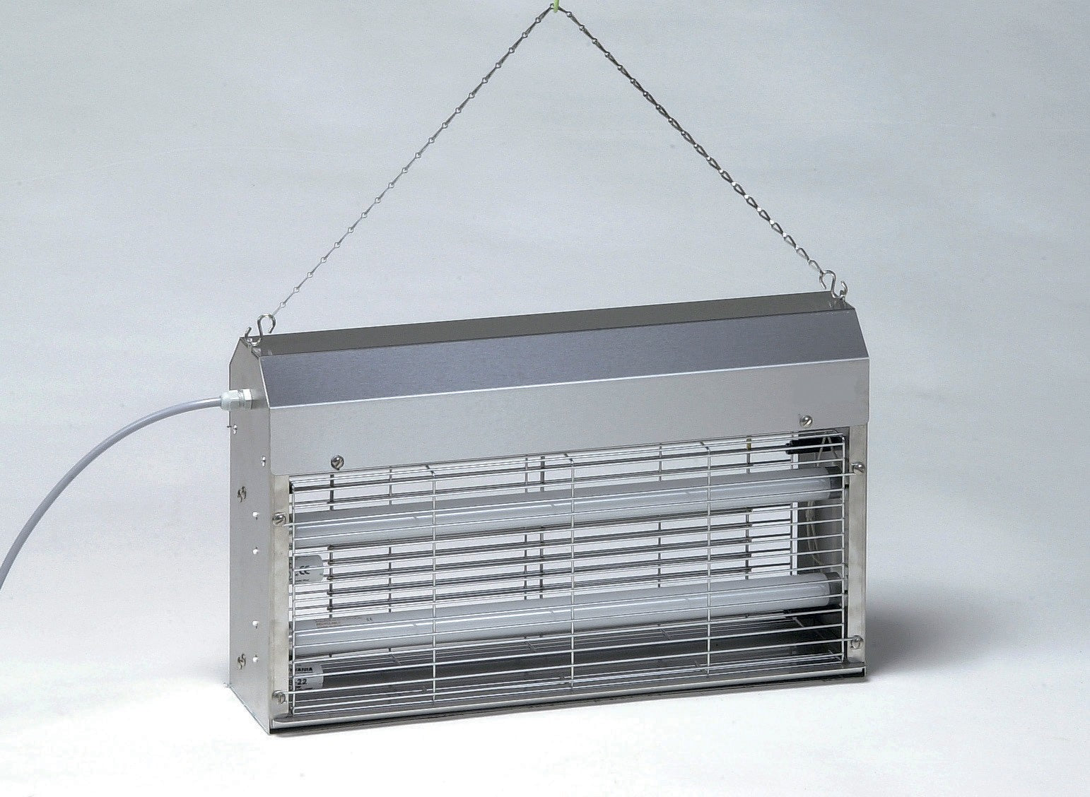 - ◗ Construction inox◗ Grilles d’électrocution et grille de protection en fil inox◗ Cordon d’alimentation longueur 1,2 m◗ Chaînette de suspension inox◗ Alimentation : 230 / 1 / t