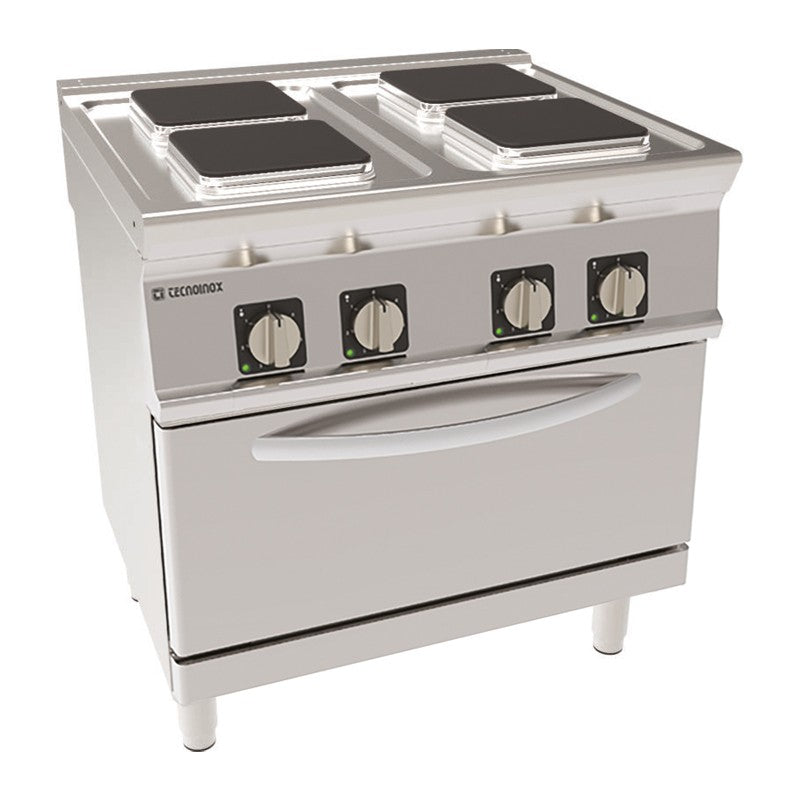 - Ce fourneau dessus électrique sur four électrique de la gamme 700 de TECNOINOX en construction tout inox avec plan de cuisson embouti d’une seule pièce avec de profondes cuvettes anti-débordement. Il est équipé de 4 plaques de chauffe carrées fixées au plan de manière hermétique (pas de risque d’infiltration des liquides), d'un thermostat de sécurité sur chaque élément chauffant pour prévenir toute surchauffe et de témoins lumineux de fonctionnement. La puissance des plaques est gérée par un régulateur 7 positions pour un réglage précis de la température de cuisson. Alimentation : 400/3/N/T.