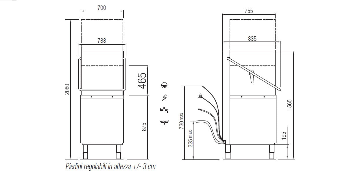 - Ce lave-vaisselle à capot ELETTROBAR utilise des paniers carrés de dimensions 500 mm x 600 mm avec une hauteur utile de 465 mm et dispose de 13 programmes de lavage.