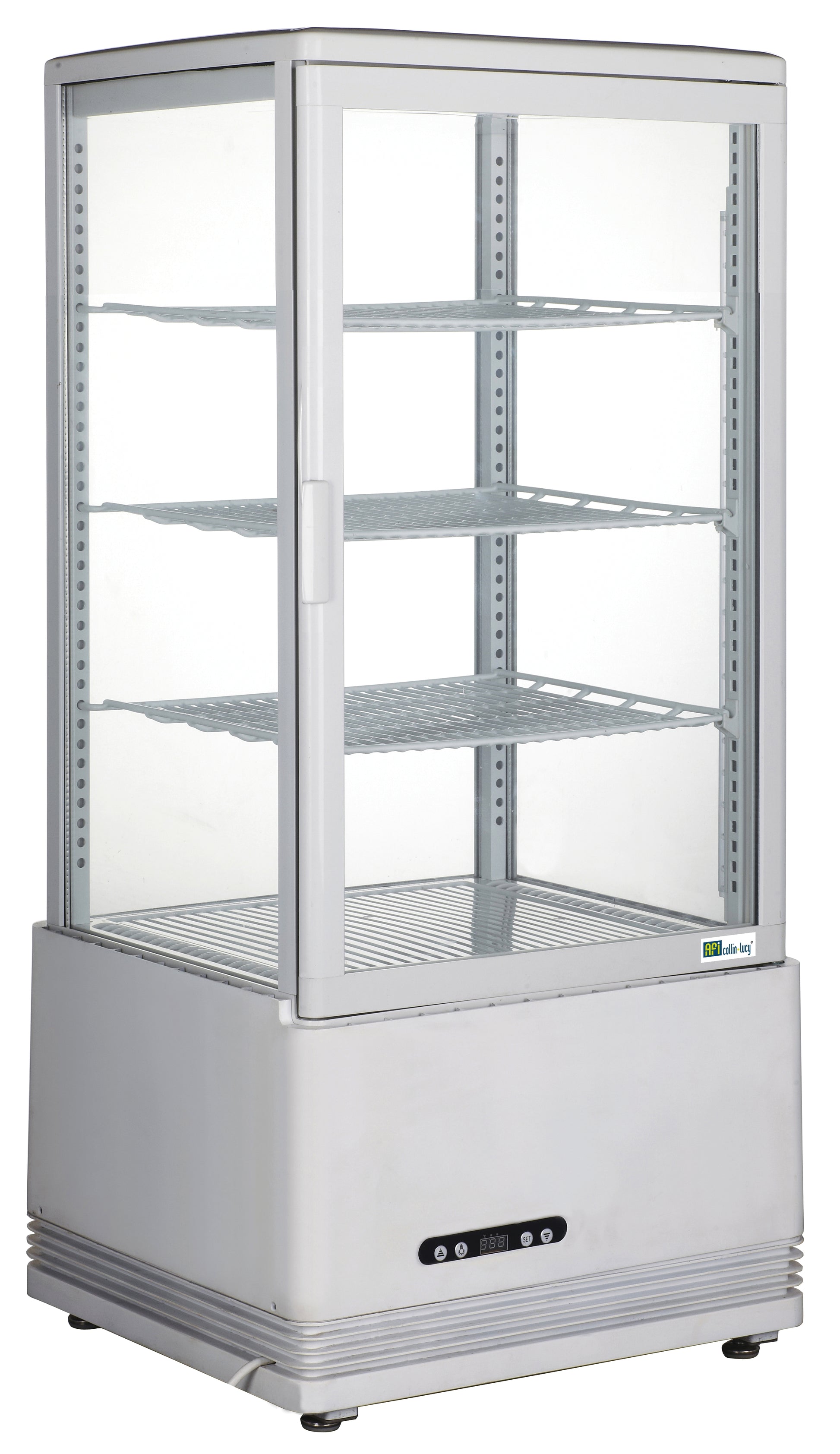 Vitrines blanches Gaz réfrigérant R134a Température 0°C/+ 12°C Éclairage supérieur interne Contrôleur de température numérique et affichage Tablettes réglables revêtues de PVC Double vitrage 4 faces Condenseur sans entretien Système de refroidissement ventilé Dégivrage automatique Conduit d'air à l'extérieur du verre pour éliminer la condensation Volume (litres) : 78 Puissance (W) : 190 Poids (kg) : 36 Dim. (mm) L x P x H : 452 x 406 x 966 . Vitrine a poser / blanc / 78cm hauteur.Parfait pour toutes les cuisines professionnelles
