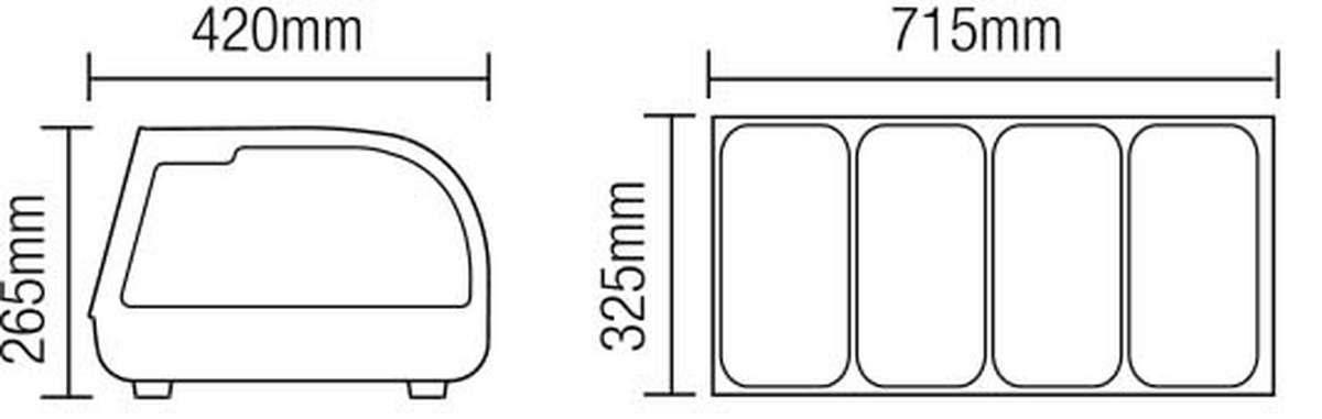 Gaz réfrigérant R134a Température 0°C/12°C Éclairage LED interne brillant sur le dessus Contrôleur de température numérique et affichage Verre incurvé avant Portes coulissantes Système de refroidissement direct Dégivrage automatique Évaporateur supérieur avec bassin pour recueillir la condensation Prévu pour bacs de 40 mm de profondeur Livrés sans bacs GN Capacité : 4 bacs GN 1/3 Puissance (W) : 180/190 Poids (kg) : 34,5 Dim. (mm) L x P x H : 1177 × 420 × 265 . Vitrine a poser portes coulissantes hauteur 265mm.Parfait pour toutes les cuisines professionnelles