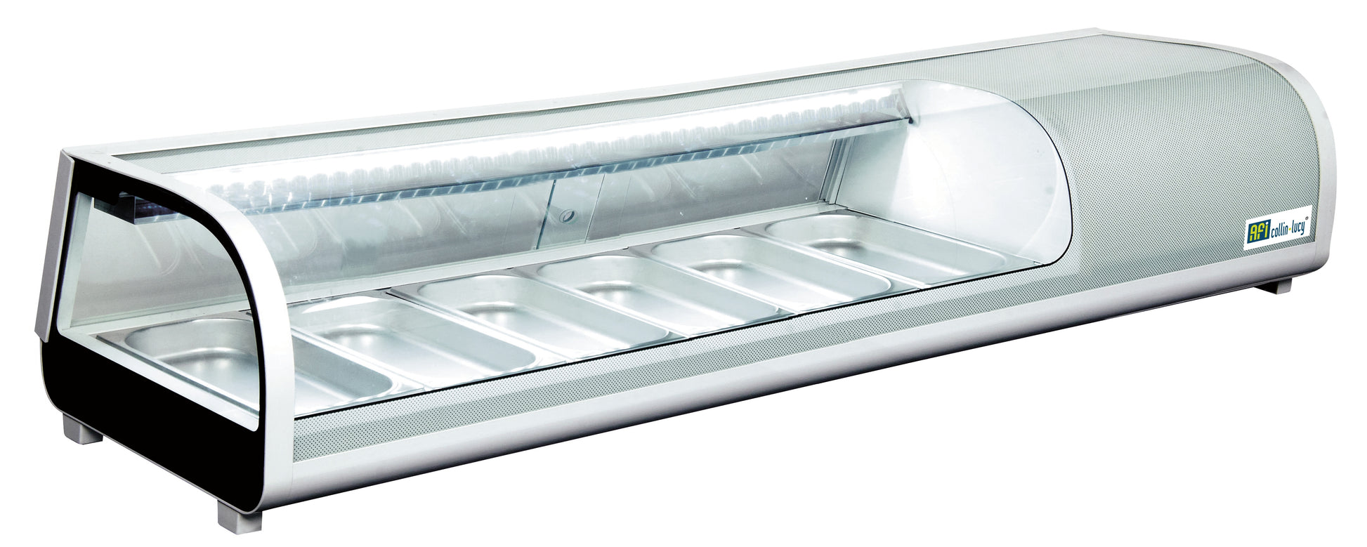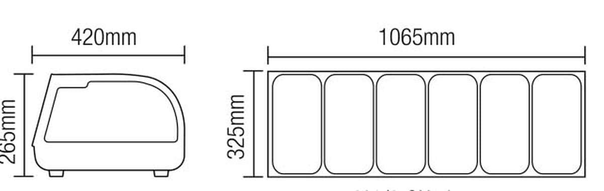 Gaz réfrigérant R134a Température 0°C/12°C Éclairage LED interne brillant sur le dessus Contrôleur de température numérique et affichage Verre incurvé avant Portes coulissantes Système de refroidissement direct Dégivrage automatique Évaporateur supérieur avec bassin pour recueillir la condensation Prévu pour bacs de 40 mm de profondeur Livrés sans bacs GN Capacité : 6 bacs GN 1/3 Puissance (W) : 180/190 Poids (kg) : 41,5 Dim. (mm) L x P x H : 1529 × 420 × 265 . Vitrine a poser portes coulissantes hauteur 265mm.Parfait pour toutes les cuisines professionnelles