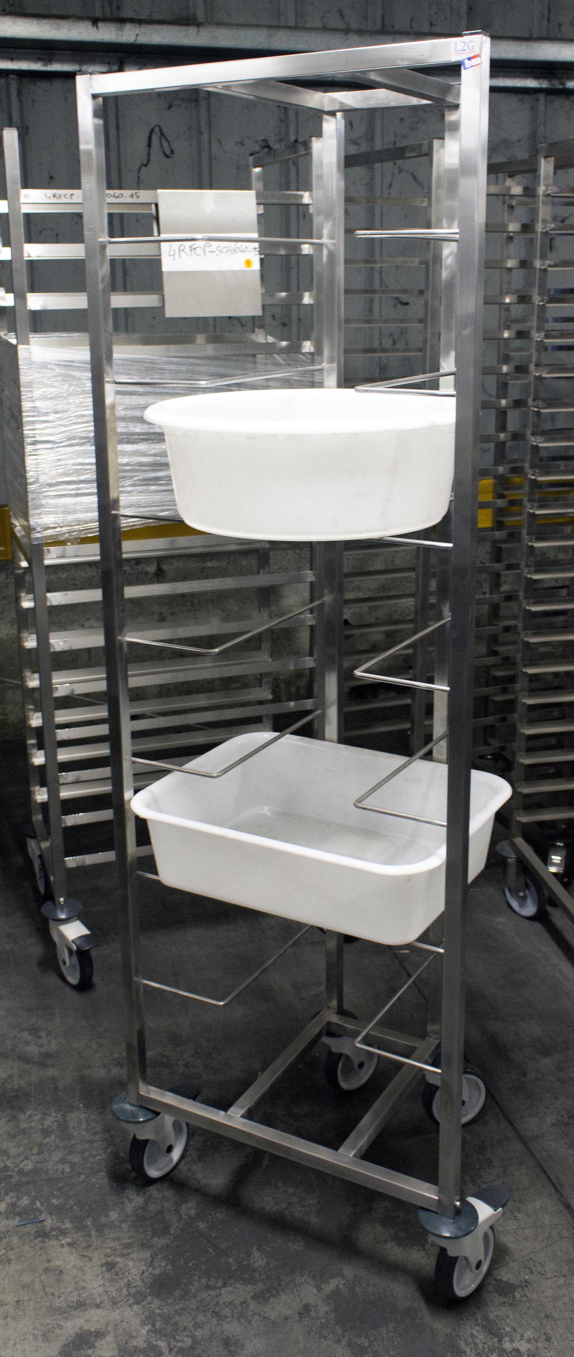 Construction inox monobloc en tube carré 25×25 mm Support de bacs en fil de 8 mm, espacement de 180 mm 4 roues caoutchouc ø 125 mm, chape polyamide, pivotantes Pour bacs de diviseuse ronds ou rectangulaires