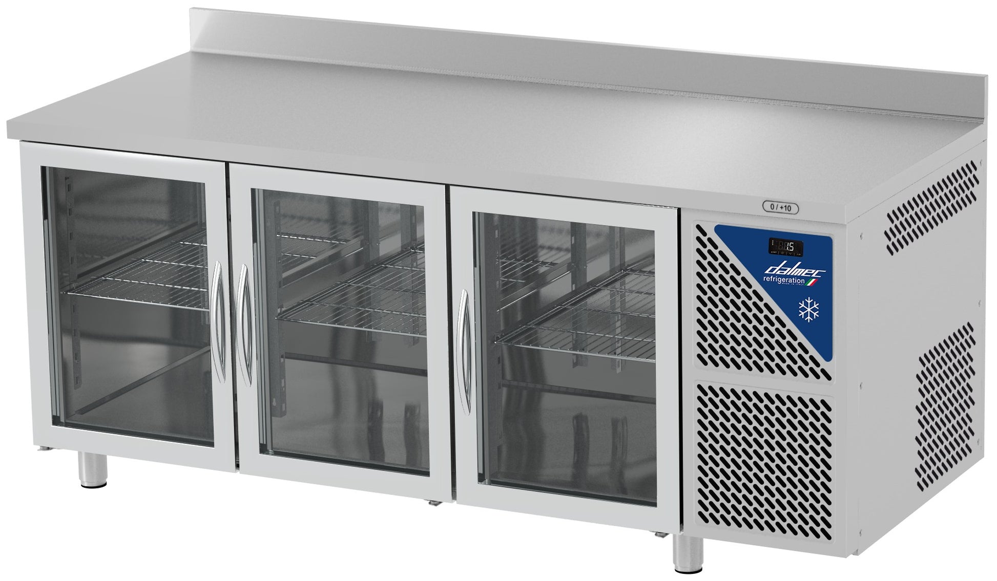 Description de la Table réfrigérée vitrée positive 0/+10°C sans groupe logé - 350 L - 3 portes - Prof. 600 - 430 x 325 - Avec dosseret - SN603SGV-3 - Dalmec