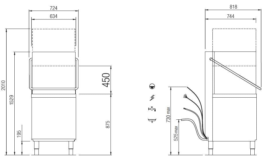- Ce lave-vaisselle à capot COLGED utilise des paniers carrés de dimensions 500 mm x 500 mm avec un passage utile de 450 mm de hauteur.