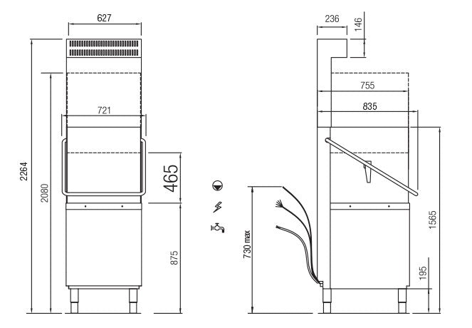 - Ce lave-vaisselle à capot COLGED utilise des paniers carrés de dimensions 500 mm x 500 mm avec un passage utile de 465 mm de hauteur.